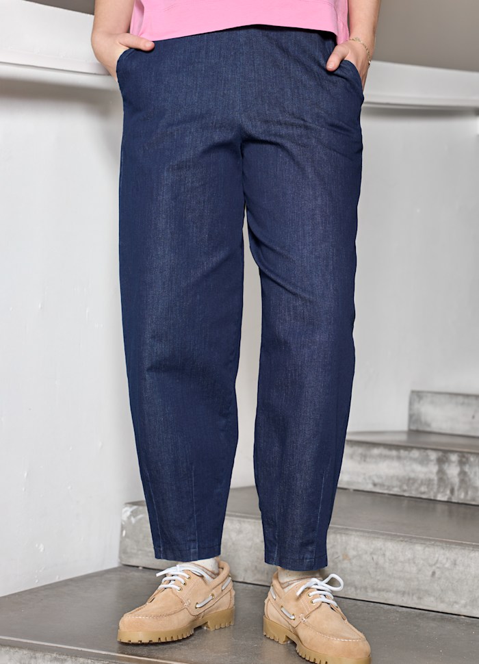 Black Colour Denice Denim Barrel Pant, a denim trouser with a “barrel” fit. This design provides a roomy silhouette with slightly rounded, tapered legs that narrow toward the bottom.