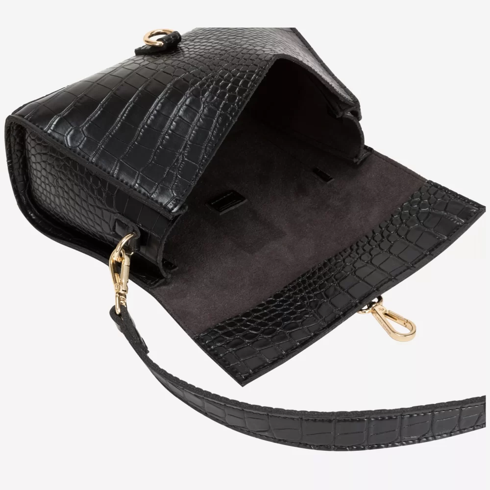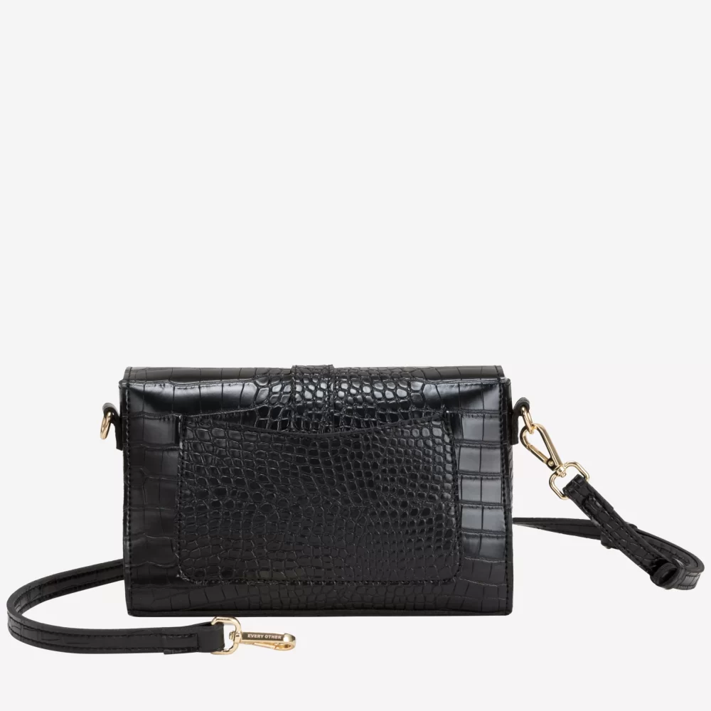 Elevate your ensemble with the Every Other Single Strap Flapover Shoulder Bag in sleek black croc. Its structured flapover design and single strap offer a chic, minimalist silhouette perfect for day-to-night wear. The textured croc finish adds a touch of luxury, making it a versatile accessory that complements both casual and sophisticated looks effortlessly.