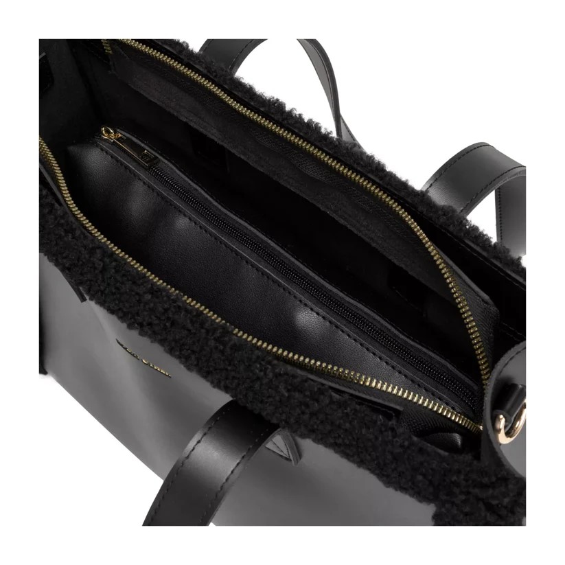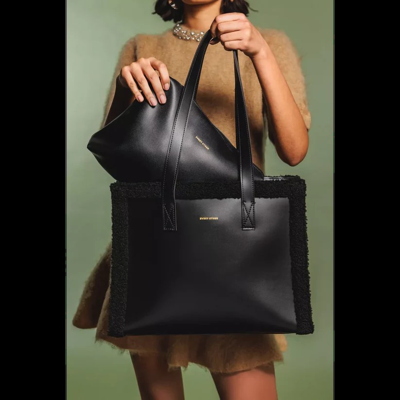 The Every Other Square Shearling Tote Bag in black combines modern design with luxurious texture. Its structured square silhouette offers ample space, while the soft shearling exterior adds a sophisticated, tactile element to any outfit. Ideal for elevating your everyday wardrobe with a chic, luxury accessory.