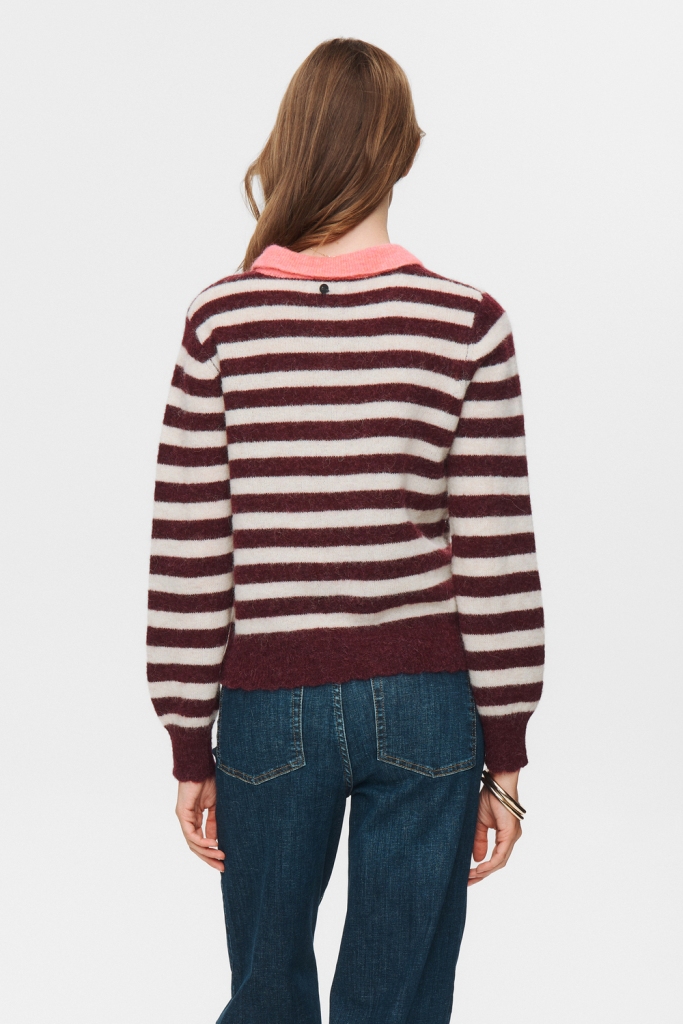 Add a playful twist to your knitwear with the Nümph Nuciara Riette stripe pullover in Winetasting. This cosy alpaca and wool blend knit features bold stripes, a contrast pink collar, and green button placket for that signature Nümph colour pop. Finished with ribbed cuffs and hem for comfort and style, it’s the perfect jumper to lift your everyday wardrobe.