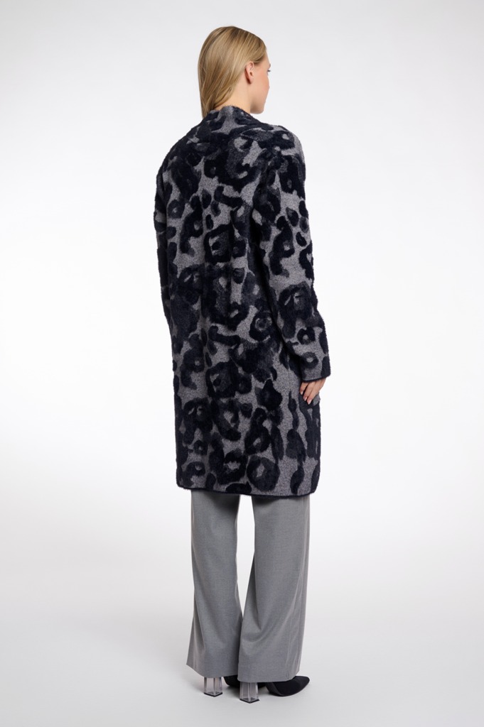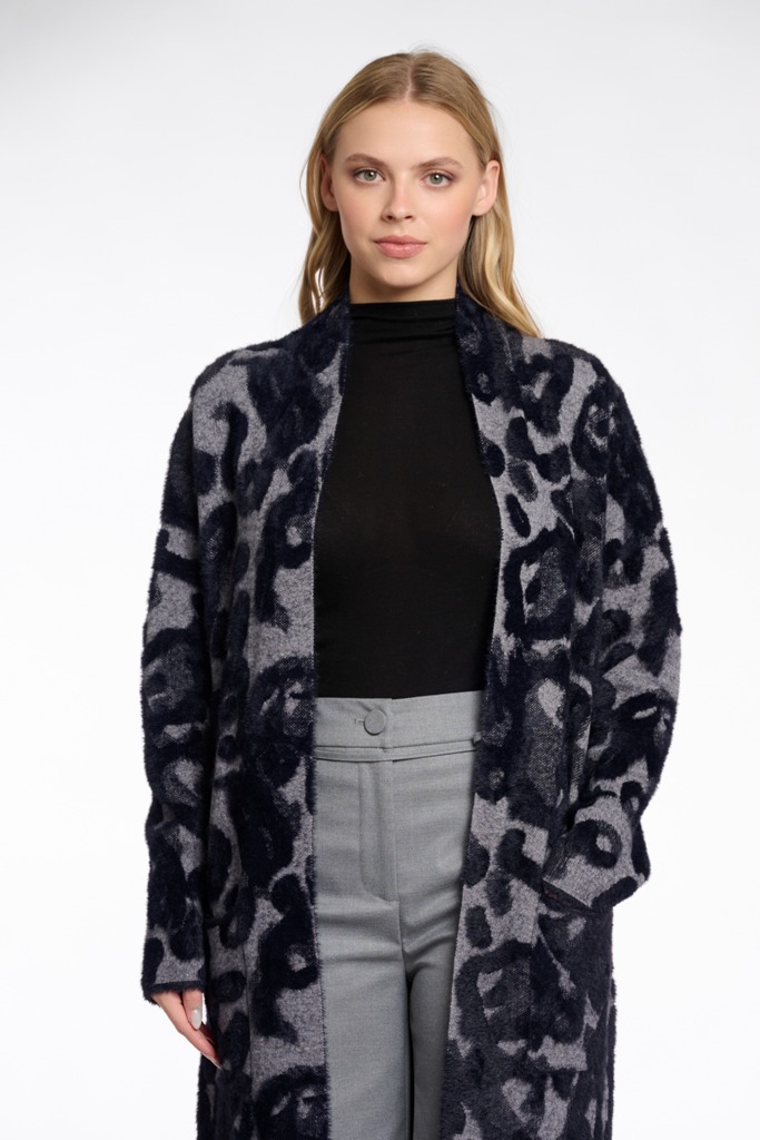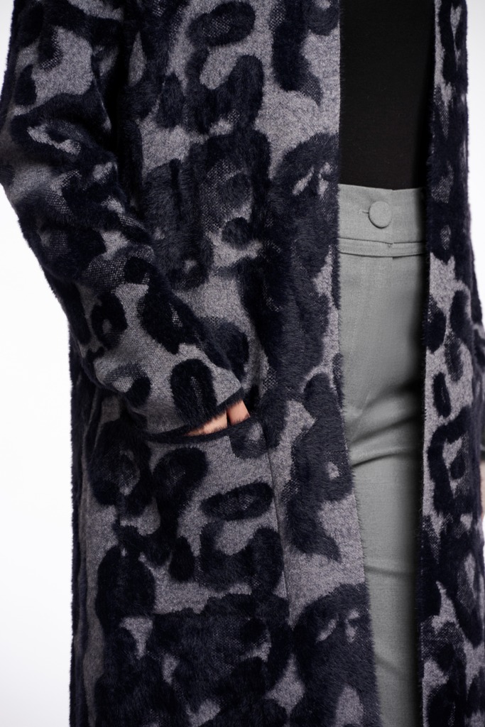 Long knitted cardigan. This medium length cardigan features a leopard print, two front pockets and a playful print. This essential piece is easy to combine for an everyday look.