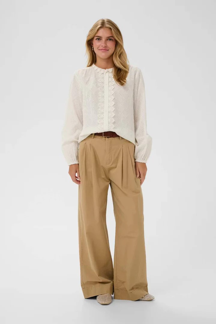 This broderie anglaise blouse features a straight fit with a gently gathered round neckline. Long sleeves have gathered cuffs, while a central panel of subtle ruffles runs down the button front. The blouse has a structured yet soft appearance and a slightly cropped length.