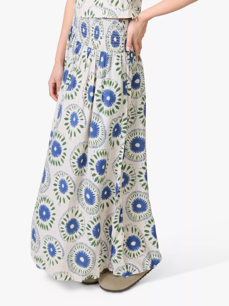 The Aurora Skirt has a classic A-Line shape, with an extra-wide elastic smocked waistband which is designed to allow for a low or high waist fit. Featuring side seam pockets. A stunning and versatile maxi skirt to add to your summer wardrobe. It has a beautifully unique print, which brings the perfect touch of summer.