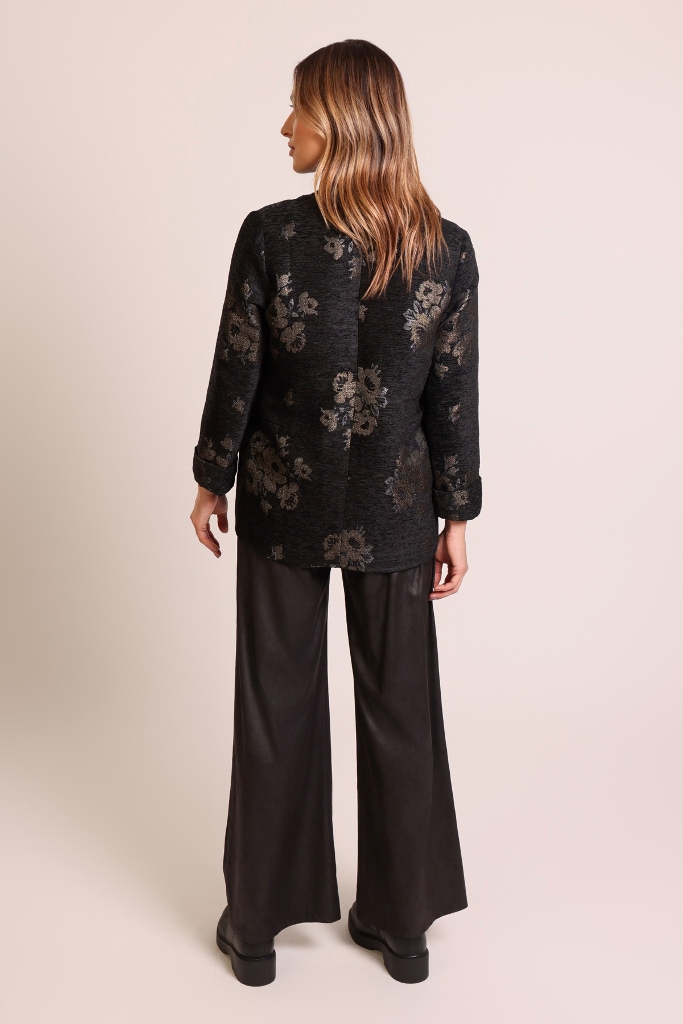 Suit jacket. Boyfriend jacket length. Shawl collar. Two front pockets. Long sleeve. Turn up cuff. Lined.